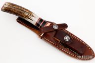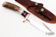 This Copper Companion by Randall Made Knives features a stainless steel blade, .168" blade stock, 1.272" blade depth. 1.5" sharpened top edge and notched thumbrest, hidden tang construction. The handle has a copper guard and butt plate, stag grip and red/black/copper/black linen micarta spacer pattern. Comes with brown leather sheath and original paper wrapping from Randall. New from maker.