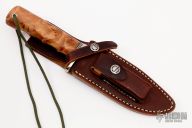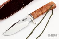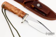 This Sergeant's Special by Randall Made Knife features a satin finished blade with sharpened top edge and a notched thumbrest, .227" blade stock and 1.391" blade depth, hidden tang construction. The handle has a nickel silver guard with a Thuya burl wood grip and black/duralumin spacers. Comes with a brown leather sheath and original paper wrapping. New from maker.