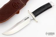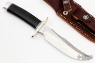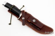 This Model 4-6F by Randall Made Knives features a satin finished blade with sharpened top edge, .189" blade stock and 1.319" blade depth, hidden tang construction. The handle has a brass double guard, black/duralumin spacers, black linen micarta grip and duralumin butt cap. Comes with a brown leather sheath and original paper wrapping. New from maker.