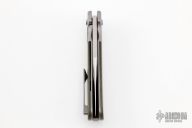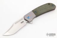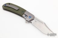 These X-Series knives from Enrique Pena/Reate Knives feature two-tone finished, S35VN blades with stonewashed grinds and satin finished flats. The bolsters/liners feature a fine bead blasted finish with green G-10 scales and blue anodized hardware. Blade is centered when closed, flips well with no wrist action needed, and locks up with no blade play. Excellent Condition. Comes with zippered case.