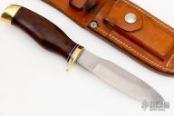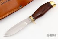 This hunter by the Late Frank Centofante features a satin finished blade with .188" blade stock and 1.005" blade depth, hidden tang construction. The handle has a brass guard and butt with cocobolo grip, white/black spacers. Comes with a brown leather sheath. Has a couple of oxidation stains near the tip of the blade, otherwise excellent condition.