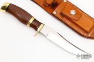 This hunter by the Late Frank Centofante features a satin finished blade with .190" blade stock and 1" blade depth, hidden tang construction. The handle has a brass guard and butt with wood grip, black spacers. Comes with a brown leather sheath. Excellent condition.