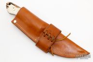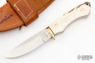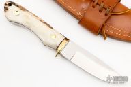 This hunter by the Late Frank Centofante features a satin finished blade with .189" blade stock and 1.094" blade depth, full tang construction. The handle has a brass guard with stag scales and black liners. Comes with a brown leather sheath. Excellent condition.