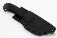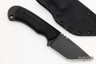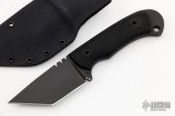 This Tanto by MMHW features a black tanto blade with notched thumbrest, full tang construction, .212" blade stock and 1.417" blade depth, full tang construction. The handle has black canvas micarta scales with lanyard hole. Comes with kydex sheath. Excellent condition.