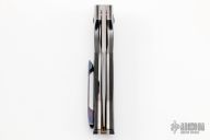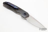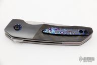 This Gent by Chad Nell features a hand rub satin finished blade with notched flipper tab. The handle has zirconium with moire black timascus collars, marble carbon fiber scales, orange peel finish titanium frame, black timascus tip up clip and matching backspacer. Rides on bearings, nice detent, lockup and blade seating. Comes with zippered case and COA dated 7/19. Includes ranger eye patch. Excellent condition