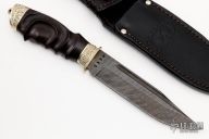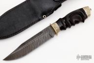This Voykar HT by Olamic Cutlery features a Vanadium Damascus clip point blade with fullers, .171" blade stock and 1.261" blade depth, hidden tang construction. The handle is comprised of a cast nickel silver guard and pommel, carved Hornbeam grip. Includes a black leather sheath with belt loop. Excellent condition. #4218. AG Russell Exclusive, 1 of 100.