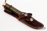 The miniature Model 27 debuted in Randall's 2012 75th anniversary catalog and is the first catalog miniature model. This knife has a 3.5" stainless steel blade, .157" blade stock and 1.052" blade depth, hidden tang construction. The handle has a copper guard and butt, green linen micarta grip, and black/copper/leather spacer pattern. Comes with a brown leather sheath and original paper wrapping. New condition.