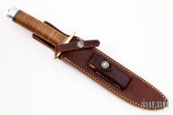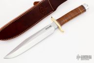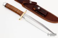"The Model 1 by Randall Made Knives was made famous by Allied combat troops in World War II and has since been widely used in all theaters of war." This knife features a satin finished blade with a sharpened top edge, .209" blade stock and 1.286" blade depth, hidden tang construction. Brass guard, stacked leather handle with red/white/blue spacers, and a duralumin butt cap. Includes a brown leather sheath and original paper wrapping. New condition.
