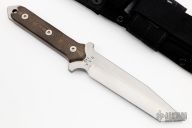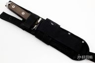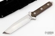 This Cold Fury by Fehrman Knives features a hand rub satin finished blade with a notched thumbrest, .250" blade stock and 1.341" blade depth, full tang construction. The handle has black/green linen micarta scales. Comes with black nylon sheath. Excellent condition. #149