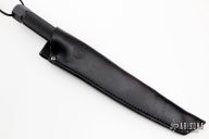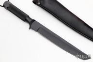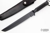 This Tanto I from Chris Reeve features a black coated tanto style blade with notched thumbrest, .263" blade stock and 1.261" blade depth, integral construction. The handle is comprised of integrally constructed A2 steel with a hollow handle and removable aluminum pommel. Includes original leather sheath with belt loop. Excellent condition. Numbered #30 on blade. Made in USA.