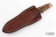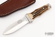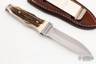 This is a very attractive boot knife from AG Russell. This is the older model made in Solingen, Germany. Blade is .102" thick and .915" deep at the ricasso and double-edged. Scales are stag. Integral construction with aluminum pins. Comes with brown leather sheath with clip. Has a couple scratches, otherwise excellent condition.