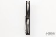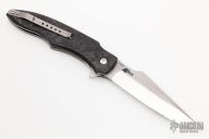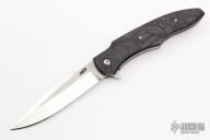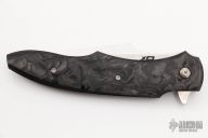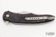 This Lincoln by Wolfgang Loerchner and Patriot Bladewerks features a satin finish clip point blade with notched thumbrest and flipper. The handle is comprised of carbon fiber scales, titanium liners and backspacer, tip up titanium clip. Comes with original box. Nice detent, lockup and blade seating. Excellent condition.