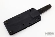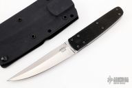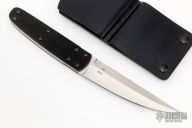 This Kwaito from Bud Nealy features a hand rub satin finished, double edged blade with notched thumb and index finger grooves, .156" blade stock and .941" blade depth. The handle is comprised of textured black G10 over full tang construction. Comes with Bud Nealy's jacket pocket sheath. Numbered 6929. Has some very light spots on the blade, otherwise excellent condition.