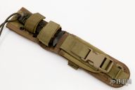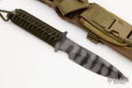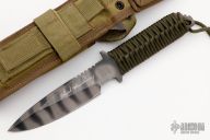 This Chuck Mawhinney "Sniper" fixed blade from Strider Knives is marked "USMC 8541". Chuck Mawhinney served in the Vietnam War and set a record number of confirmed kills for a USMC sniper. The CPM S30V blade has flat ground edge and sharpened top edge. The tiger striped blade is marked with a "Chuck Mawhinney" signature. Full tang construction makes this knife very solid. Handle is paracord wrapped (green) and features jimping on the blade spine for thumb. Includes heavy duty Eagle Brand Nylon sheath system with felt bonded Kydex liner & accessory pouch. Has some scuffs and scratches, otherwise excellent condition.