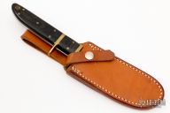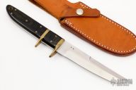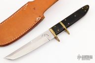 This TN Sub-Hilt Tanto by Enedino De Leon features a satin finished blade with false top edge, .129" blade stock and .996" blade depth, full tang construction. The handle has a brass guard and sub-hilt with black linen micarta scales and white liners. Has a couple light scratches and a little patina on the brass, otherwise excellent condition. Includes leather sheath with belt loop.