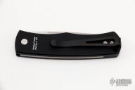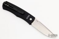 This Magic BR-1 Bolster Release Automatic from Pro-Tech Knives features a drop point stonewashed blade with swedge. The handle is comprised of a black aluminum frame with checkered bolster. Black coated stainless steel clip is positioned for tip up carry. Lanyard hole in the pommel. Includes original box and papers. Excellent condition.