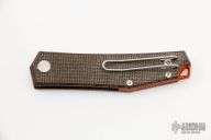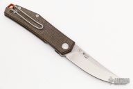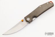 This ACE Clyde by Giant Mouse Knives features a stonewashed upswept blade with an orange thumb stud and backspacer. The handle features green canvas micarta scales. Excellent Condition.