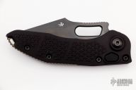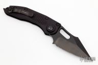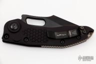 This Signature Series Stitch Auto by Microtech Knives features a partially serrated DLC tumble finished blade and false top edge, notched thumb and finger rests. The handle has a black anodized and milled aluminum handle with a bronzed titanium backspacer, DLC stainless steel hardware and clip, tip up carry, lanyard hole at the butt. Comes with original box and papers. S/N of 288 and dated 09/2021. Excellent condition.