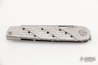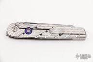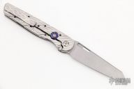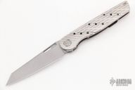 This Cortex by Brown Knives features a clip point stonewashed finish blade with notched thumbrest and flipper. The handle has a milled titanium frame with faux bolsters, backspacer and tip up clip with hidden screws. Has overtravel stop. Rides on bearings, nice detent, lockup and blade seating. Comes with original box and COA #383. New from Maker.