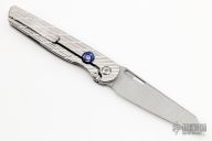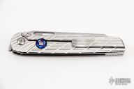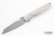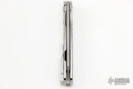 This Cortex by Brown Knives features a clip point stonewashed finish blade with notched thumbrest and flipper. The handle has a milled titanium frame with faux bolsters, backspacer and tip up clip with hidden screws. Has overtravel stop. Rides on bearings, nice detent, lockup and blade seating. Comes with original box and COA #384. New from Maker.
