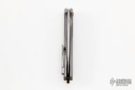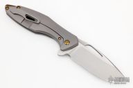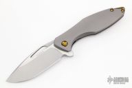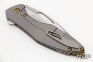 This Arius by Koenig knives features a two-tone blade with thumbhole and flipper. The handle has a nicely milled titanium frame with an anodized tip up clip, bronze anodized titanium backspacer and hardware. Has ceramic bearings and a ceramic detent ball. Nice detent, lockup and blade seating. Comes with original box and COA dated January 13, 2022.  New condition.