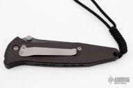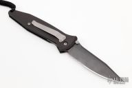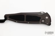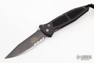 This Socom D/A tactical side-opening automatic by Microtech has a black coated partially serrated blade. Dated 6/98. Has a black aluminum handle with rubber inserts, all hardware including clip is bead blasted. Strong action and perfect lockup. Comes with box and papers. Excellent condition.
