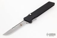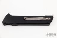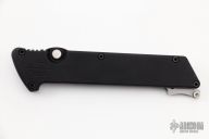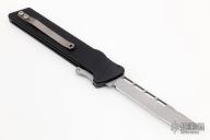 This M-6 OTF automatic by Rob Dalton features a bead blasted blade and a black aluminum handle with a tip up titanium clip. Fires via push button and retracts by holding the button and moving the slider on the side of the knife. Comes with a zipper case. Excellent condition.