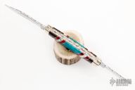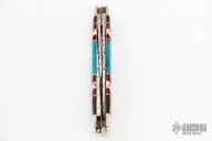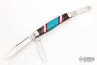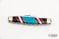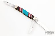 This 3-Blade Stockman by Indian Head Knives features mirror finished blades with nail nicks and fileworked spines. The handle has double nickel silver bolsters, custom ironwood/jasper/turquoise covers, brass liners, fileworked stainless steel springs. Includes a hard case and COA from Ken Metsala who did the custom covers and filework. Excellent condition.
