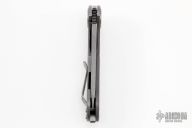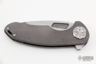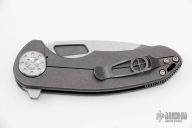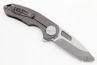 This F3 by Curtiss Knives features a stonewashed blade with notched thumbrest and flipper. The handle has a tumbled titanium frame with a matching tip up titanium clip. Satin stainless hardware. Rides on bearings, nice detent and lockup.  Comes with original box, zipper case, COA, patch and sticker pack. New from maker.