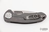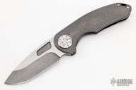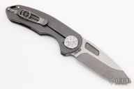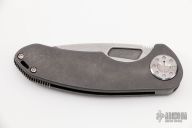 This F3 by Curtiss Knives features a stonewashed blade with notched thumbrest. The handle has a tumbled titanium frame with a matching tip up titanium clip. Satin stainless hardware. Rides on bearings, nice detent and lockup.  Comes with original box, zipper case, COA, patch and sticker pack. New from maker.