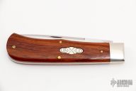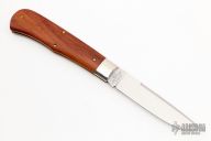 This Pioneer Trapper by Great Eastern Cutlery features a satin finished blade with nail nick. The handle has nickel silver pinched bolsters, bubinga wood covers, brass liners/pins/lanyard hole, stainless steel spring, nickel silver escutcheon. Has half stop, flush in the open and closed positions. Comes with original tube. Excellent condition.
