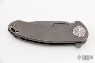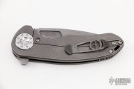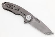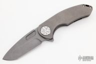 This F3 by Curtiss Knives features a stonewashed blade with notched thumbrest and flipper. The handle has a tumbled titanium frame with a matching tip up titanium clip. Satin stainless hardware. Rides on bearings, nice detent and lockup.  Comes with original box, zipper case, COA, patch and sticker pack. New from maker.
