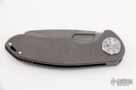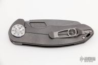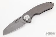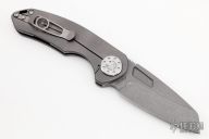This F3 by Curtiss Knives features a stonewashed blade with notched thumbrest. The handle has a tumbled titanium frame with a matching tip up titanium clip. Satin stainless hardware. Rides on bearings, nice detent and lockup.  Comes with original box, zipper case, COA, patch and sticker pack. New from maker.