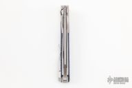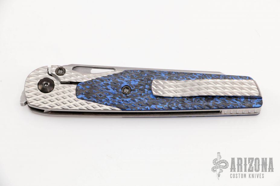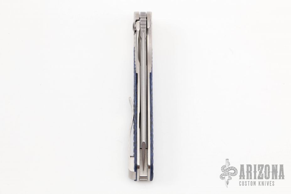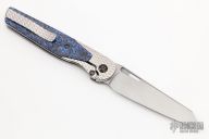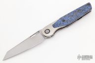This Cortex by Brown Knives features a stonewashed polish finish blade with notched thumbrest and flipper. The handle has a milled titanium frame with integral bolsters, zirconium pivot collars, black/blue carbon fiber scales, milled titanium backspacer and tip up clip with hidden screws. Rides on bearings, nice detent, lockup and blade seating. Comes with original box and COA #305. New condition.