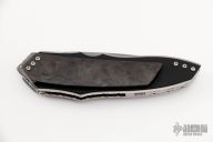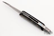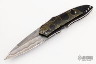 The Xplain Flipper by Corrie Schoeman features a blade with a false top edge, hamon, fileworked spine and under ricasso. The handle has a raffir noble front scale over black G-10 marble carbon fiber tip down clip on the other side, fileworked and anodized titanium liners and backspacer with abalone inlay. Has citrine stones set in the flipper. Rides on bearings, nice detent, lockup and blade seating. Has a couple light scratches, otherwise excellent condition.