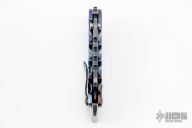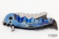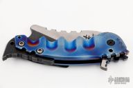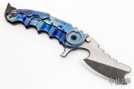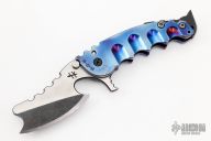 This Man of War flipper by TS Heeter features a two-tone blade with notched thumbrest and flipper. The handle has an anodized titanium frame with tip up reversible titanium clip, black oxide finished 3V steel backspacer. Has a pin with split ring in the butt that can be used to lock the blade open, or it can be removed to reveal a lanyard hole. Nice detent, lockup and blade seating. Comes with original box and COA dated 9-28-17. Has some light scratches, otherwise excellent condition.