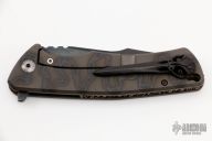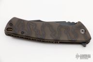 This Framelock Model S1 by Michael Zieba features a distress blued blade with notched thumbrest and flipper. The handle has a flame finished titanium frame with black titanium tip up clip, cast skull brass backspacer. Nice detent, lockup and blade seating. Has bearings and a ceramic detent ball. Comes with original box and COA dated 1-10-19. Excellent condition.