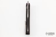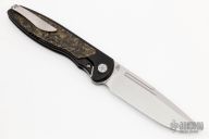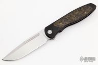 This Mini Tempest from Brian Nadeau features a hand rub satin finished drop point blade with a fuller and notched thumbrest/front flipper. The handle has a black PVD titanium frame with Gold Dark Matter FatCarbon inlays, satin titanium tip up clip. Nice detent, lockup and blade seating, stainless lockface insert. Includes original box. New from maker!