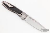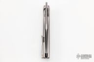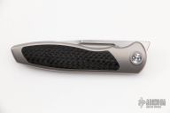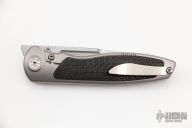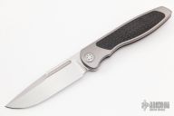 This Mini Tempest from Brian Nadeau features a hand rub satin finished drop point blade with a fuller and notched thumbrest/front flipper. The handle has a bead blasted titanium frame with carbon fiber inlays, satin titanium tip up clip. Nice detent, lockup and blade seating, stainless lockface insert. Includes original box. New from maker!