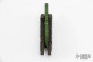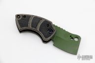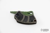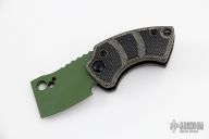 This Korvid Friction Folder by Justin Koch of Koch Tools features a chisel ground green coated blade with notched thumbrest and friction bar. The handle is comprised of black canvas micarta scales over a titanium barrel spacer. Lanyard hole in pommel. Excellent condition.