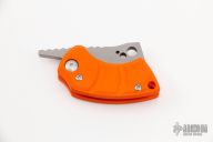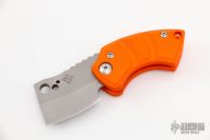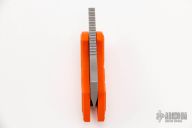 This Korvid Friction Folder by Justin Koch of Koch Tools features a bead blasted blade with notched thumbrest and friction bar. The handle is comprised of orange G-10 scales over a titanium barrel spacer. Lanyard hole in pommel. Excellent condition. Comes with COA dated 12-19