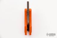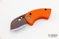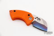 This Korvid Friction Folder by Justin Koch of Koch Tools features a chisel ground titanium blade with notched thumbrest and friction bar. The handle is comprised of orange G-10 scales over a titanium barrel spacer. Lanyard hole in pommel. Excellent condition. Comes with COA. Comes with cloth case by Dragoncut.