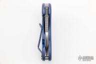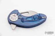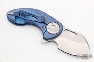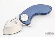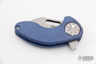 This Nano framelock flipper by Curtiss Knives features a stonewashed blade with notched thumbrest and flipper, and a thumbhole. The handle has a tumbled and anodized titanium frame with cutouts and tip up clip. Stainless steel lock insert. Nice detent, lockup and blade seating. Rides on caged bearings. Excellent condition. Comes with a zippered case.
