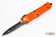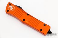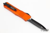 This Combat Troodon OTF automatic by Microtech knives features a black double edged double full serrated blade, and an orange aluminum handle with black hardware, tip down carry. Glass breaker. S/N 25711. Dated 11/2019. Comes with original box. Has some scuffs and scratches, otherwise good condition.