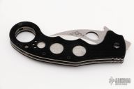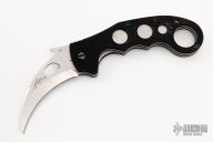This Emerson Super Karambit Flipper has a stonewashed chisel ground hawk bill blade with notched thumbrest, thumbhole, flipper and wave feature. Handle is comprised of black G10 scales, titanium liners with and has a lanyard hole at the butt. Also has a black stainless steel clip positioned for right or left-handed tip up carry. Nice detent, lockup and blade seating. Serial number 1840. Excellent condition. Comes with original box and papers.
