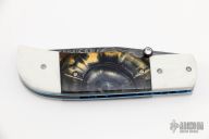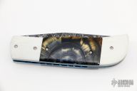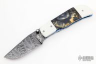 This knife by Jake Elenbaas features a clip point Alabama Damascus blade with single thumbstud with CZ stone inlay. The handle has white G-10 bolsters, front and rear, stabilized cross cut mammoth ivory scales, anodized titanium liners with jeweled interiors and a black G-10 backspacer. Nice lockup, detent and blade seating. Comes with COA. New from maker.