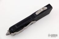 This Executive Scarab features a bead blasted tanto blade with a fully serrated edge. The handle is black aluminum with a tip down stainless clip and glass breaker. Dated 02/2015 and #13219. Comes with a Microtech box and papers. Excellent condition.