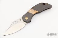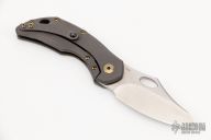 This Busker B570S by Olamic Cutlery features a satin finished drop point blade with swedge, thumb hole and front flipper. The handle is comprised of a blasted titanium frame with mokume inlay, anodized and fileworked floating titanium backspacer. Titanium tip up clip is positioned for tip up carry. Anodized titanium hardware. Includes padded and zippered case and makers card dated 5/28/21. Excellent condition.