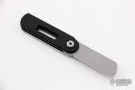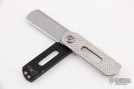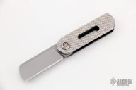 This Ovalmoon by Darriel Caston features a chisel ground and bead blasted blade. The handle is milled titanium and aluminum. The frame is held in place by a pivot and magnets. Comes with original box. Excellent condition.