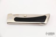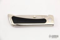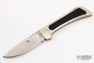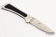 This Lockback Folder by Jimmy Lile features a satin finished blade with dual thumbstuds. The handle has a nickel silver frame with black paper micarta inlays and stainless steel backspacer. Nice blade seating and lockup. Has some light scratches, otherwise good condition.